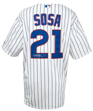 Sammy Sosa Signed Chicago Cubs White Pinstripe Majestic Replica Baseball Jersey - Schwartz Authenticated