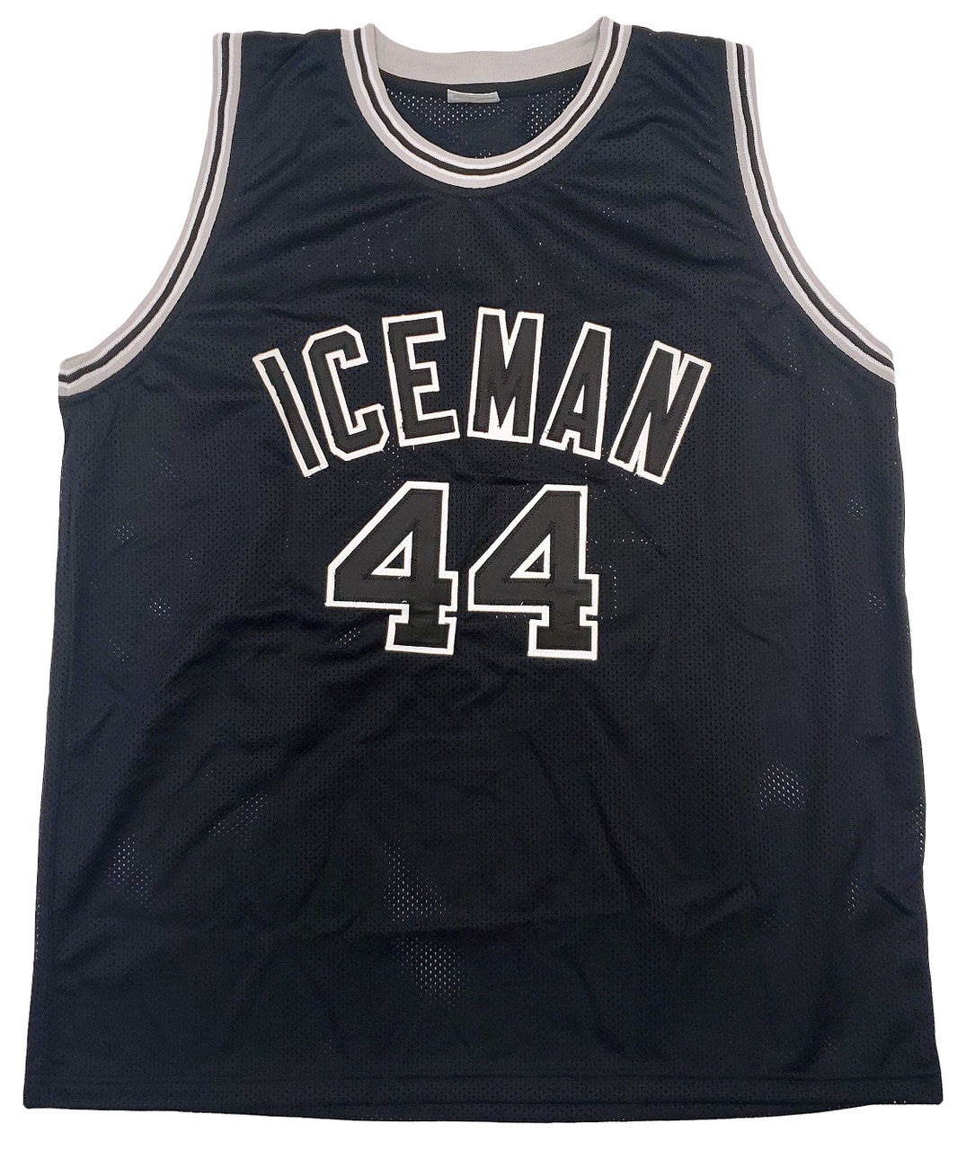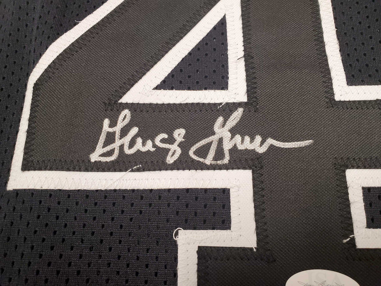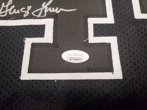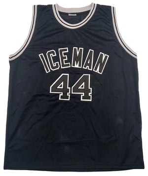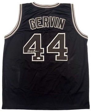 This is a Black Jersey that has been hand signed by George Gervin. This is a custom jersey with no name brand. The approximate size is XL. It has nice sewn in name and numbers. This item has been certified authentic by JSA and comes with their tamper-proof sticker and matching certificate of authenticity.