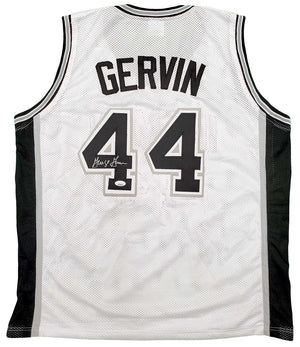 This is a White Jersey that has been hand signed by George Gervin. This is a custom jersey with no name brand. The approximate size is XL. It has nice sewn in name and numbers. This item has been certified authentic by JSA and comes with their tamper-proof sticker and matching certificate of authenticity.