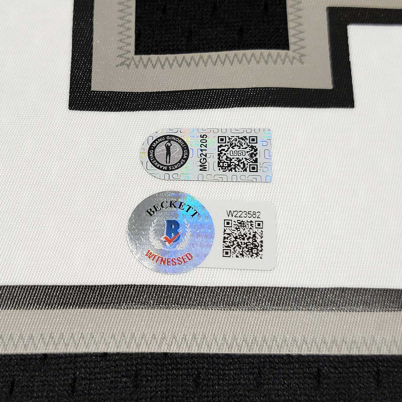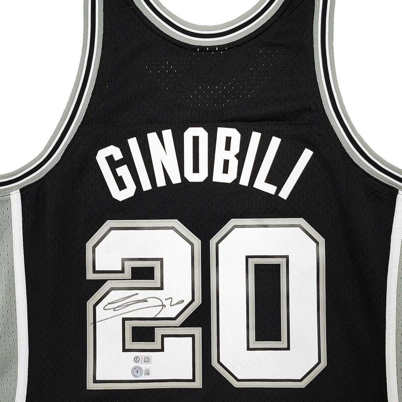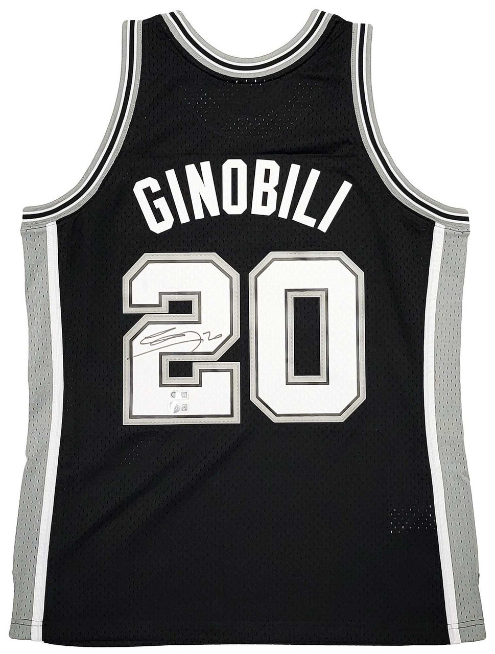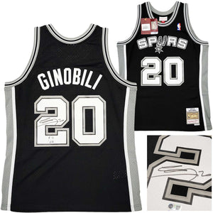 This is a Black Authentic Mitchell & Ness San Antonio Spurs Hardwood Classics 2002-03 Swingman Jersey that has been hand signed by Manu Ginobili. This jersey is Size L. This item has been witnessed and certified authentic by Beckett Authentication (BAS) and comes with their tamper-proof witness sticker. Beckett Authentication has recently changed their physical certificate card policy where they no longer match their tamper-proof sticker with a physical certificate. A certificate can be printed on Beckett's website for the matching authentication number.