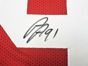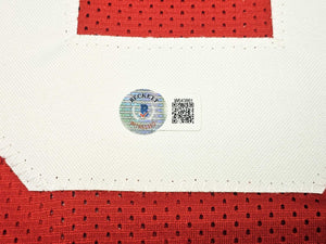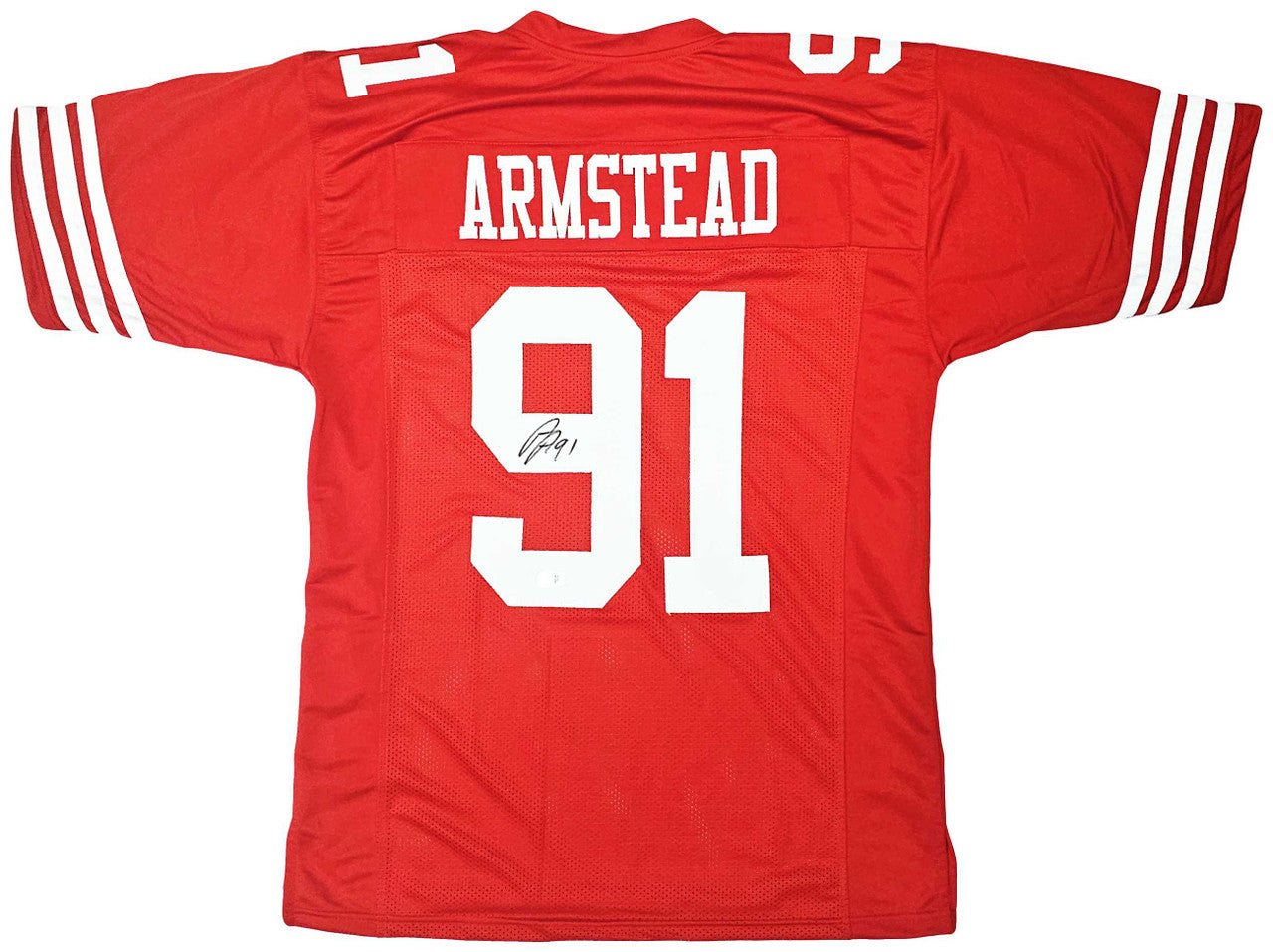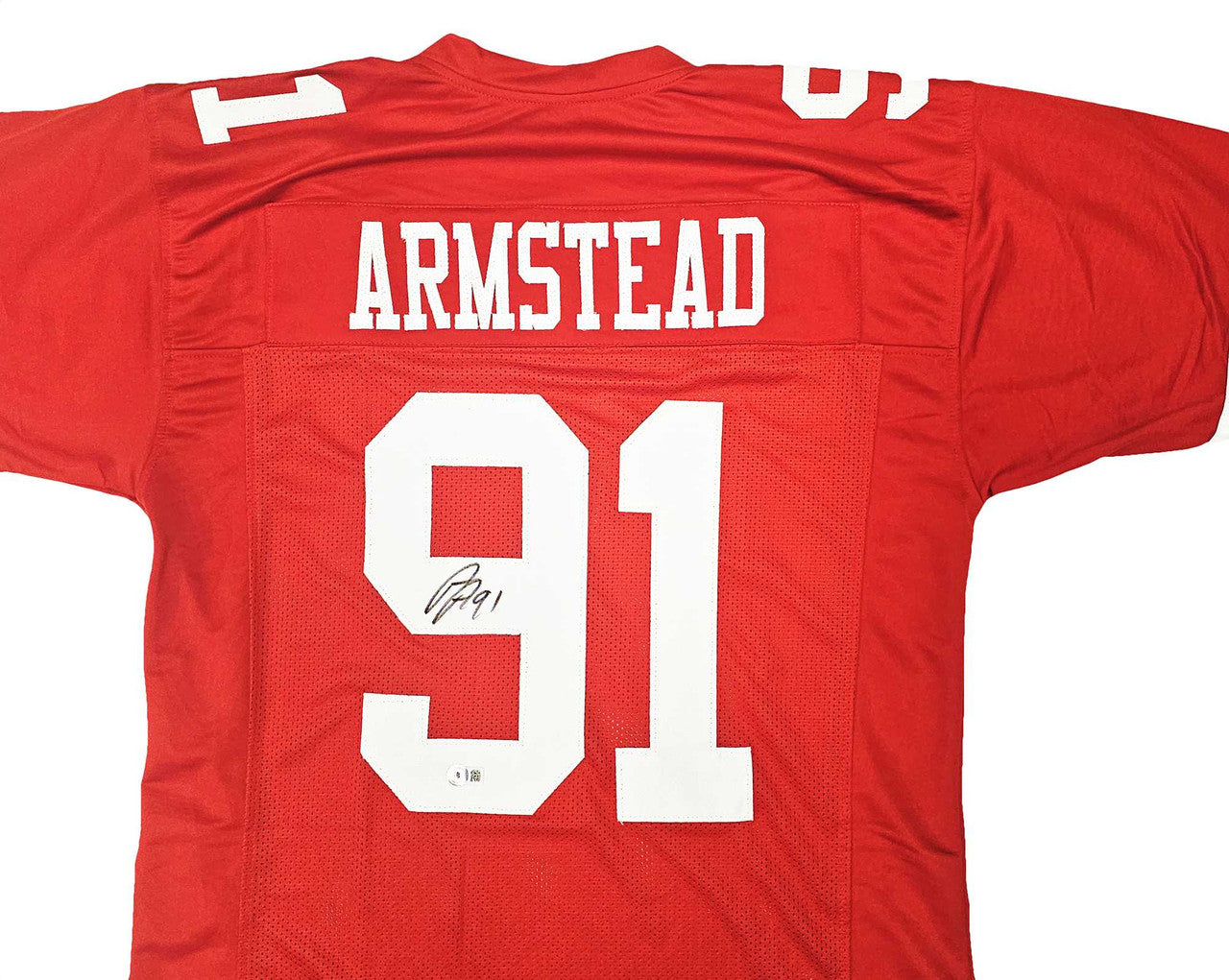 This is a Red Jersey that has been hand signed by Arik Armstead. This is a custom jersey with no name brand. The approximate size is XL. It has nice sewn in name and numbers. This item has been witnessed and certified authentic by Beckett Authentication (BAS) and comes with their tamper-proof witness sticker.
