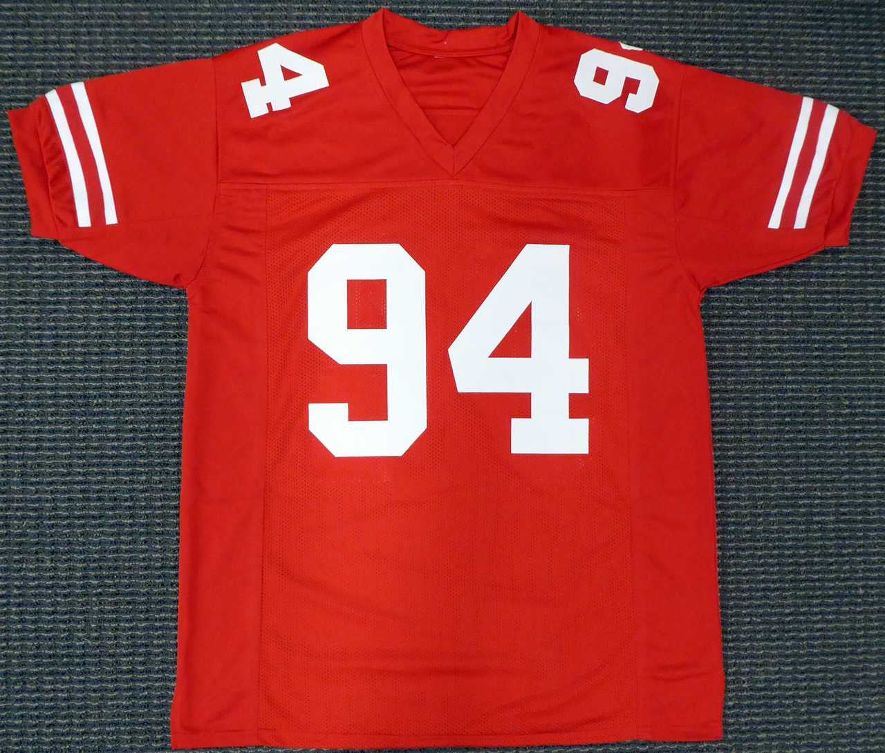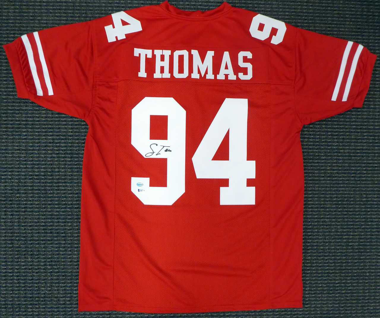 This is a Red Custom Jersey that has been hand signed by Solomon Thomas. This is a custom jersey with no name brand. The approximate size is XL. It has nice sewn in name and numbers. This item has been certified authentic by Beckett (BAS) and comes with their tamper-proof sticker and matching certificate of authenticity.