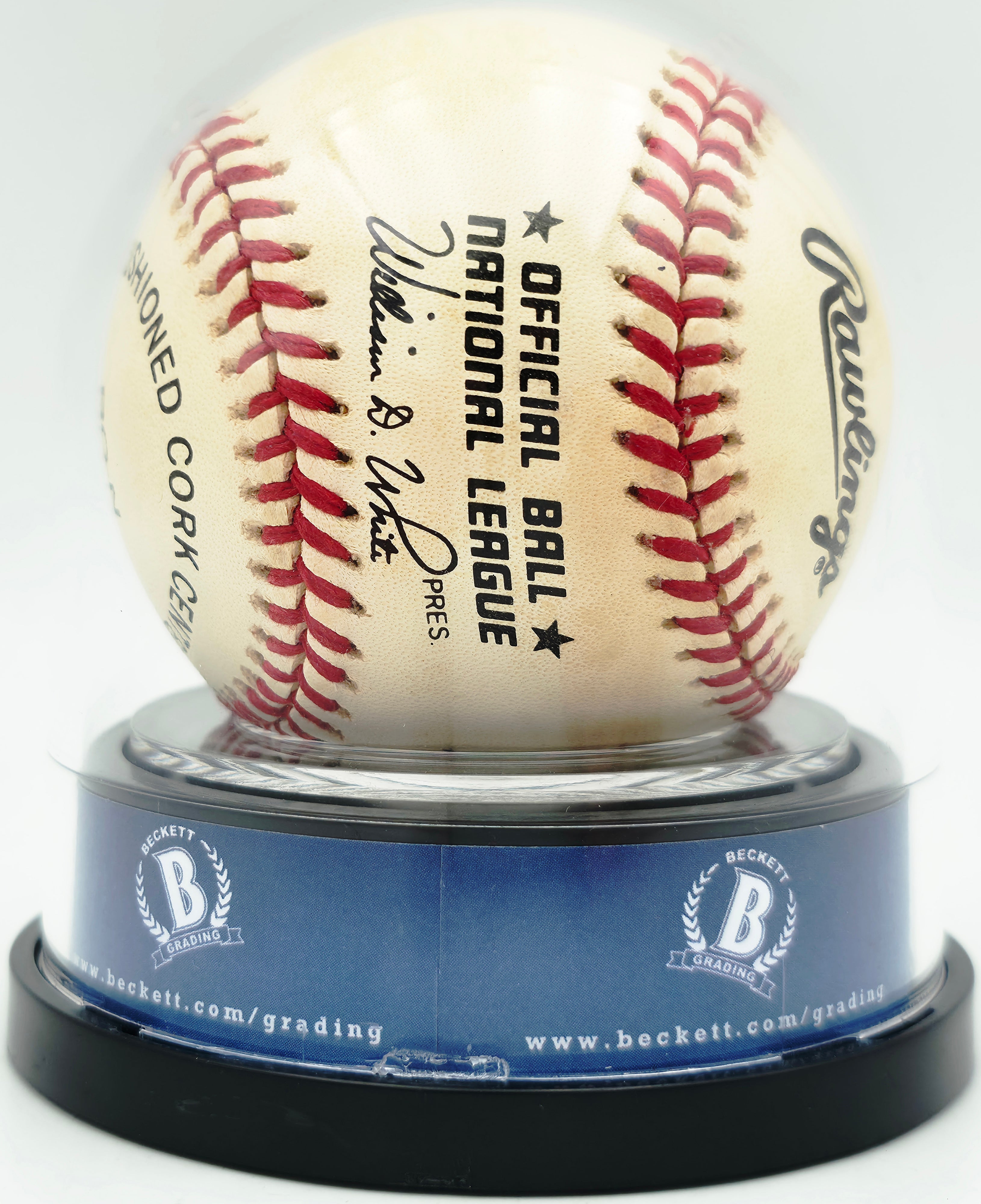 A Note on the Ball's Condition — Toning This Official National League Baseball displays natural toning — the gradual deepening of leather color that occurs over time in all genuine vintage signed baseballs. Toning is not a signature defect and does not factor into the autograph grade, which evaluates only the quality of Koufax's signature itself. The Mint 9 grade is assigned to the autograph on this ball — a near-perfect signature — independently of the ball's age-appropriate toning. The encapsulation permanently preserves both the signature and the ball in their current state.