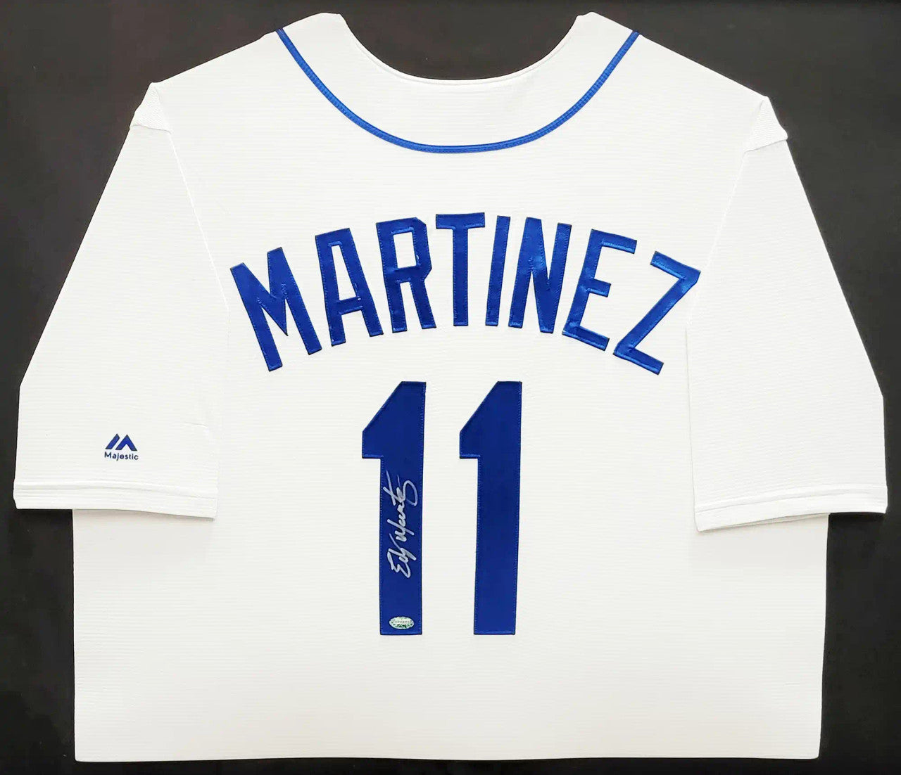 This is a framed White Majestic Seattle Mariners Jersey, approximately 31x36 with the frame, that has been hand signed by Edgar Martinez. This item was signed in the presence of a Mill Creek Sports representative and comes with their serial numbered hologram and matching certificate of authenticity.