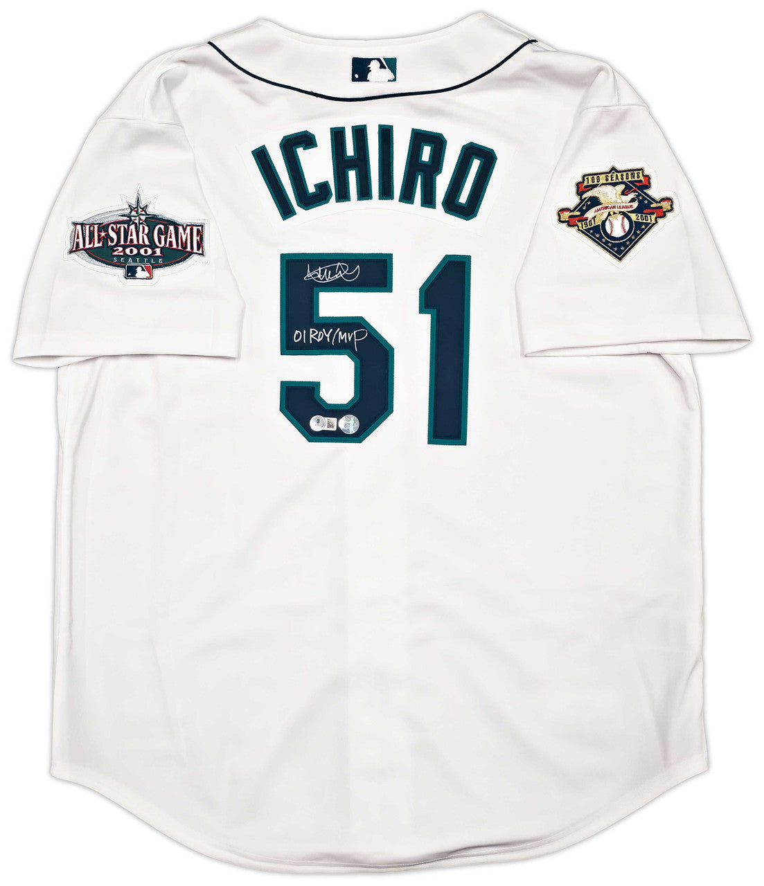 Seattle Mariners Ichiro Suzuki Autographed White Authentic Mitchell & Ness Cooperstown Authentic Collection 2001 ASG Patch Rookie Jersey Size 52 "01 ROY/MVP" IS Holo & Beckett BAS Witness
