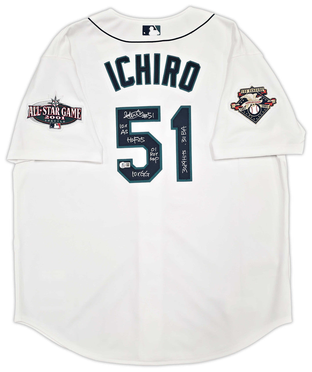 This jersey is further enhanced with a 2001 All-Star Game patch and includes a highly desirable 7-stat inscription written by Ichiro himself: #51, HOF 25, .311 BA, 10x GG, 10x AS, 01 ROY/MVP, 3089 Hits. These career-defining accolades elevate this piece into true museum-quality territory.