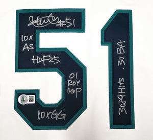 The jersey includes seven career-defining statistics written by Ichiro himself, significantly increasing collectibility and long-term value.
