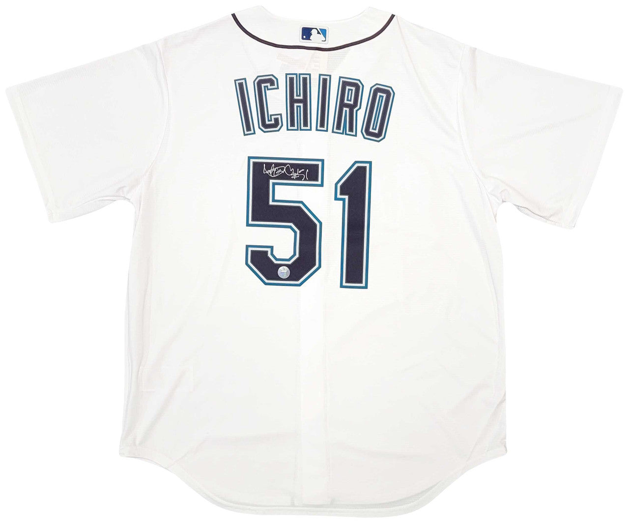 This is a White Nike Seattle Mariners Jersey that has been hand signed by Ichiro Suzuki. This jersey is Size L. This item was inscribed "#51." This item has the official tamper-proof Ichiro Suzuki hologram and matching certificate of authenticity.