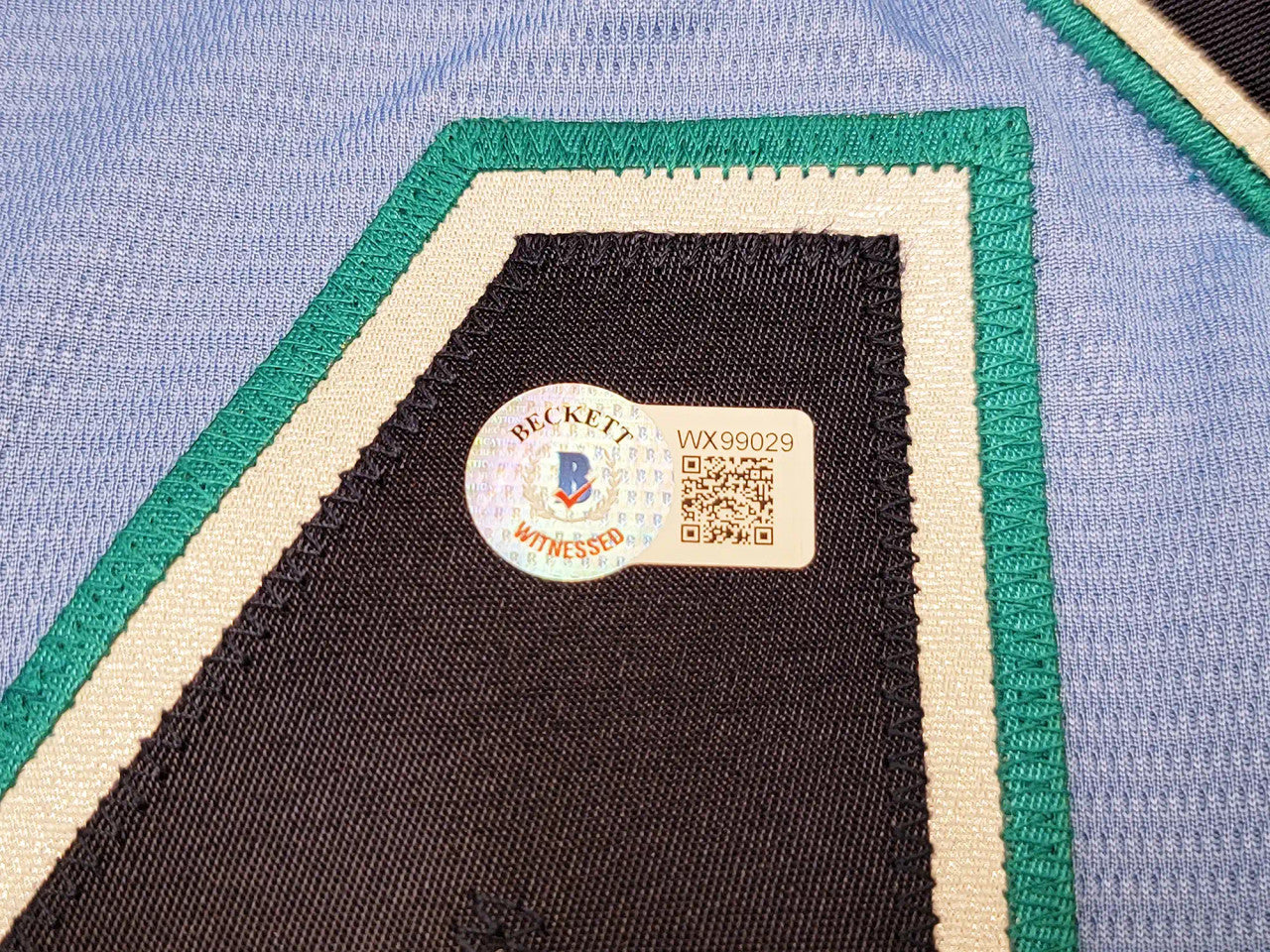 This is a Light Blue Nike Seattle Mariners Spring Training Jersey that has been hand signed by Julio Rodriguez. This jersey is Size L. This item has been witnessed and certified authentic by Beckett Authentication (BAS) and comes with their tamper-proof witness sticker. Beckett Authentication has recently changed their physical certificate card policy where they no longer match their tamper-proof sticker with a physical certificate. A certificate can be printed on Beckett's website for the matching authentication number.