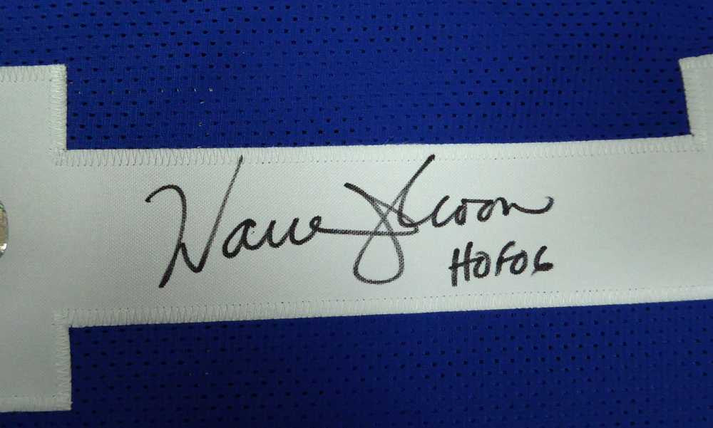 This is a Blue Custom Jersey that has been hand signed by Warren Moon. This is a custom jersey with no name brand. The approximate size is XL. It has nice sewn in name and numbers. This item was signed in the presence of a Mill Creek Sports representative and comes with their serial numbered hologram and matching certificate of authenticity.