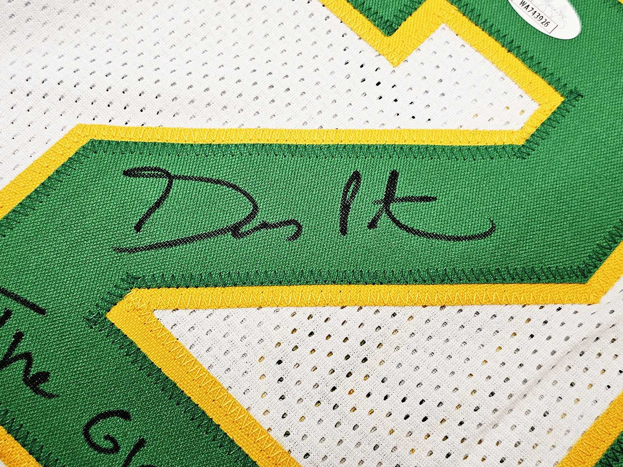 This clean and classic white SuperSonics custom jersey features green and gold trim, professionally stitched name and numbers, and an ideal autograph area on the back. Gary Payton’s bold signature paired with the inscription “The Glove” adds significant collector value and instantly elevates this jersey as a premium display piece.