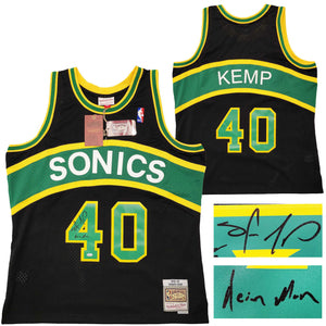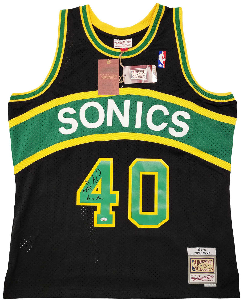 This is a Black Authentic Mitchell & Ness Seattle Supersonics Hardwood Classics Swingman Jersey that has been hand signed by Shawn Kemp. This jersey is Size XL. Kemp signed on the front of this jersey. This item was inscribed "Reign Man." This item was signed in the presence of a Mill Creek Sports representative and comes with their serial numbered hologram and matching certificate of authenticity.