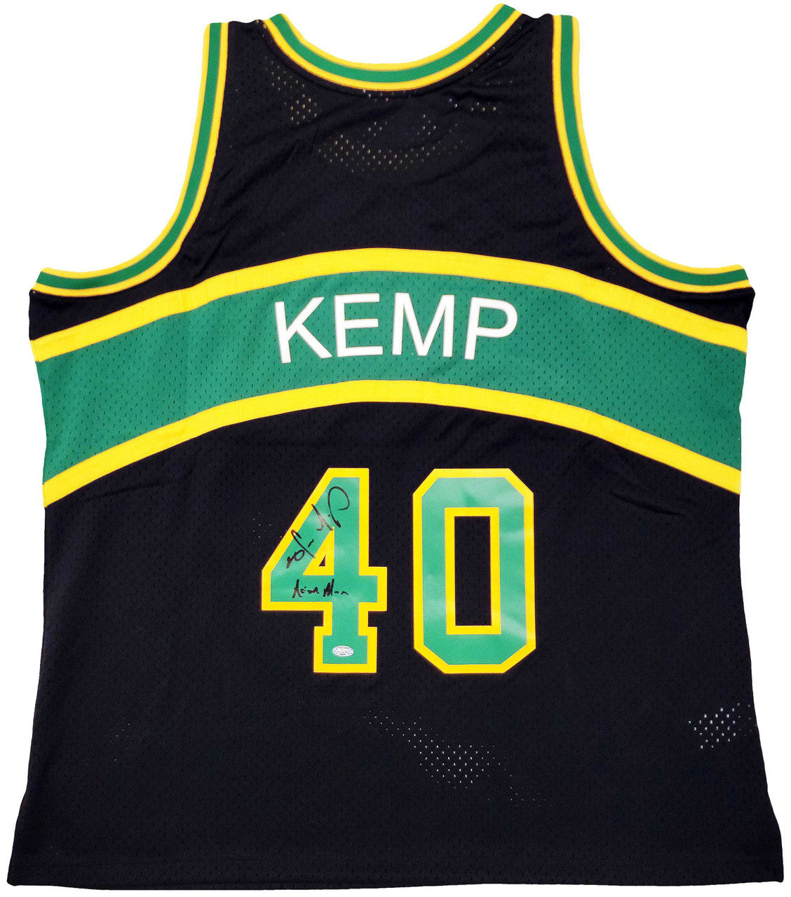 This is a Black Authentic Mitchell & Ness Seattle Supersonics Hardwood Classics Swingman Jersey that has been hand signed by Shawn Kemp. This jersey is Size XXL. This item was inscribed "Reign Man." This item was signed in the presence of a Mill Creek Sports representative and comes with their serial numbered hologram and matching certificate of authenticity.