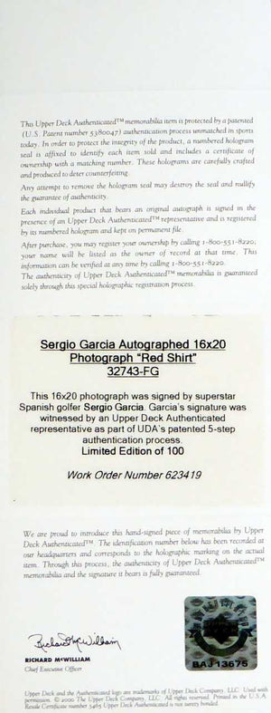This is a Framed 16x20 Photo, approximately 24x28 with the frame, that has been hand signed by Sergio Garcia. This is a limited edition item and is serial numbered /100. It has been certified authentic by Upper Deck Authentication (UDA) and comes with their sticker and matching certificate of authenticity.
