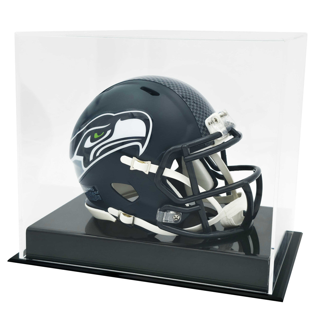 The single acrylic mini football helmet display case is made of 1/8'' thick acrylic and features a clear acrylic removable lid and black base. It is perfect for displaying a collectible mini football helmet. Measures 5.75''x7.5''x8.75''. Memorabilia sold separately. Does not fit Hockey mini helmets.