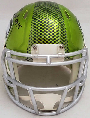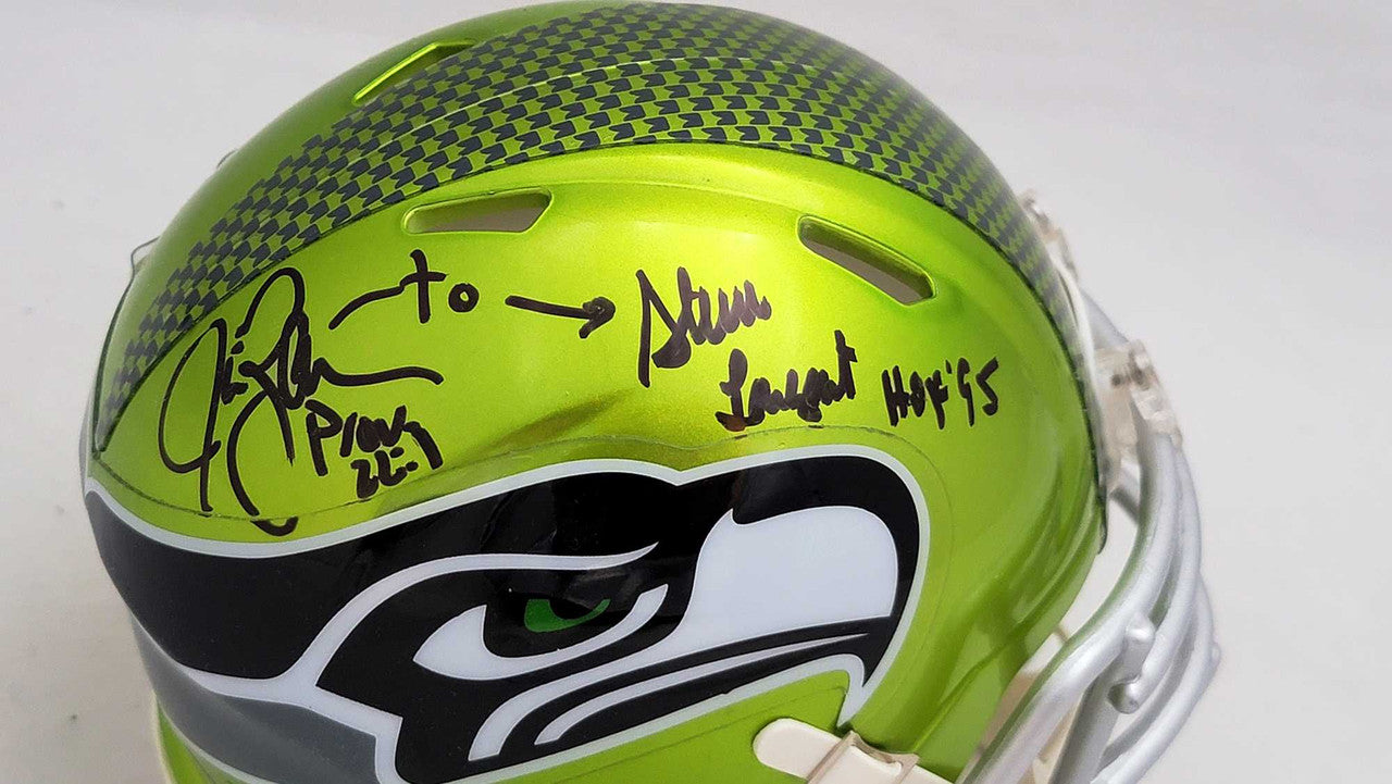 This is a Seattle Seahawks Flash Green Speed Mini Helmet that has been hand signed by Steve Largent & Jim Zorn. The Flash helmets are delicate and may have some marks or scratches on them. This item was signed in the presence of a Mill Creek Sports representative and comes with their serial numbered hologram and matching certificate of authenticity.