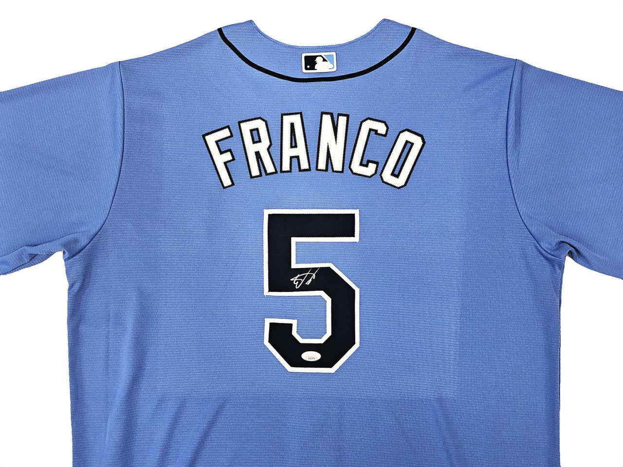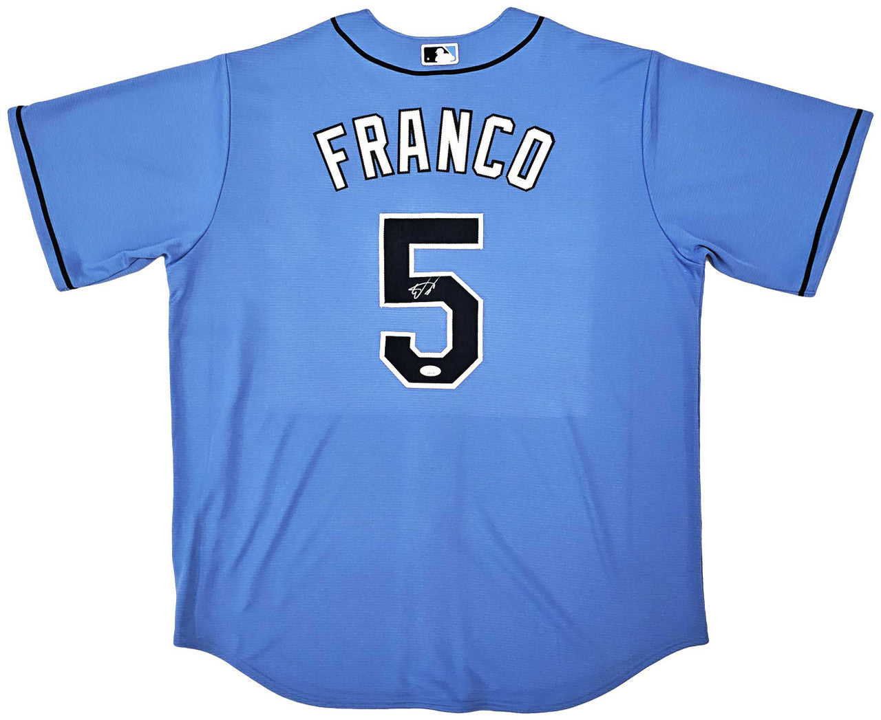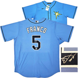 This is a Blue Nike Tampa Bay Rays Jersey that has been hand signed by Wander Franco. This jersey is Size XL. This item has been certified authentic by JSA and comes with their tamper-proof sticker and matching certificate of authenticity.