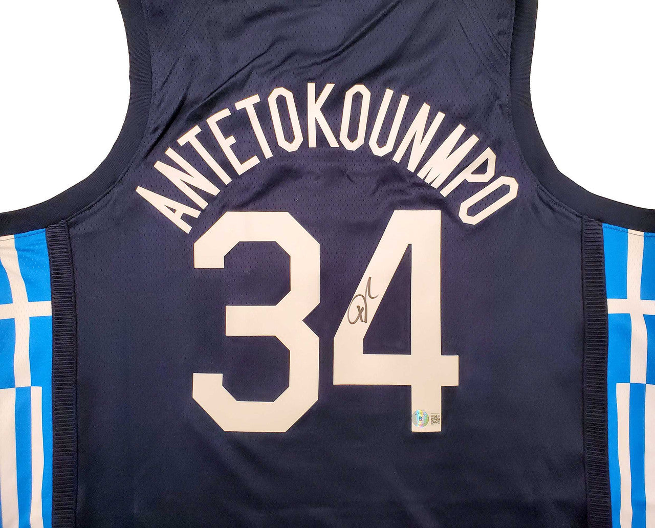 This authentic Team Greece Blue Nike Jersey has been hand-signed by Giannis Antetokounmpo and certified authentic by Beckett Authentication Services (BAS) through their advanced QR Code Verification Program. Each autograph is backed by a tamper-proof Beckett hologram that can be scanned and verified online for lifetime authenticity.