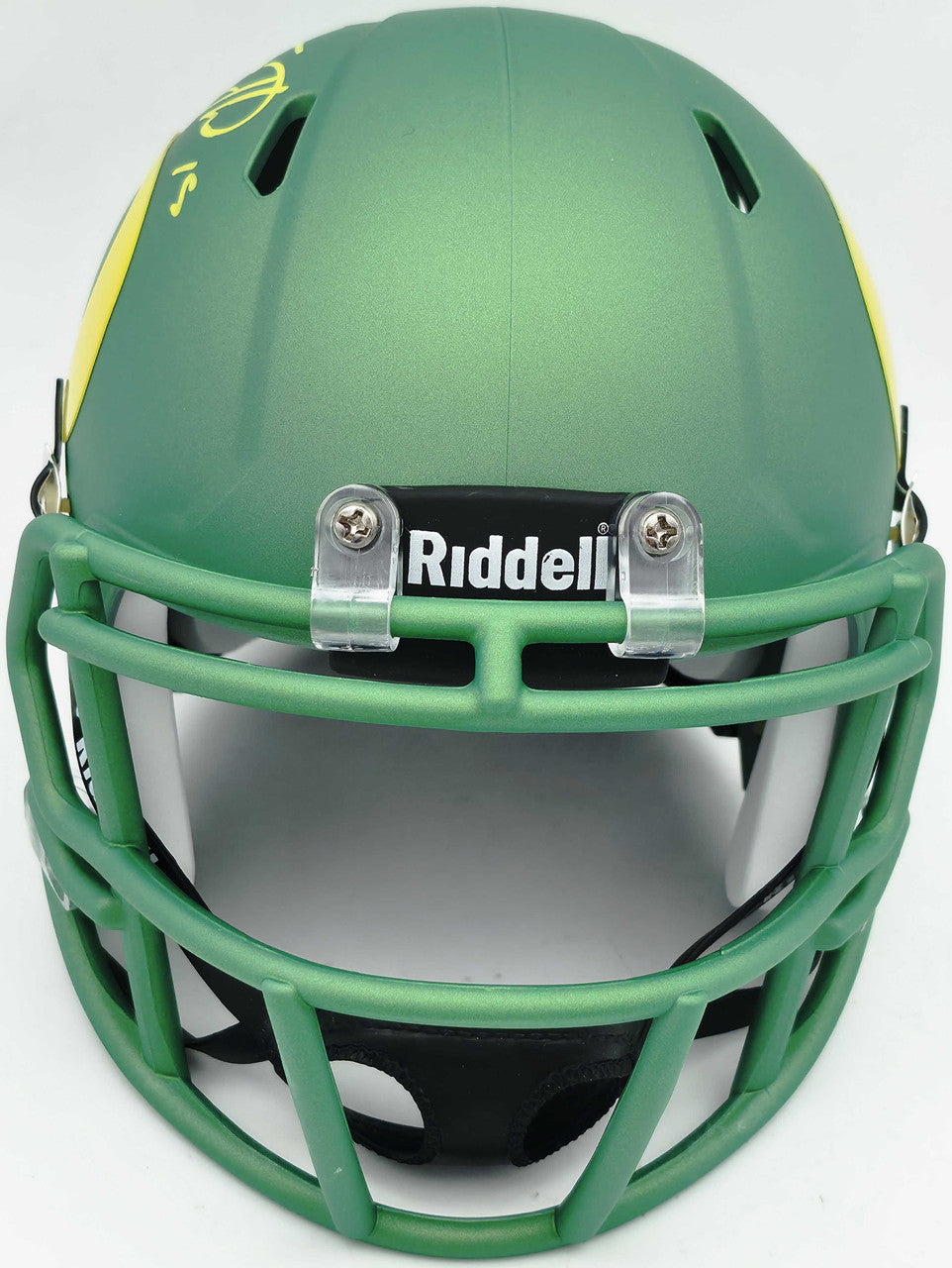 This striking mini helmet has been hand signed by Tez Johnson, one of the most dynamic playmakers in Oregon Ducks history. Finished in the iconic Apple Green colorway, this Speed mini helmet is a bold and modern display piece for Ducks fans and college football collectors alike.