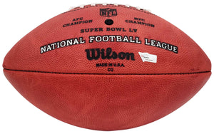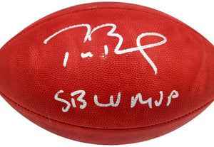 This is an Official NFL Leather Super Bowl LV Logo Football that has been hand signed by Tom Brady. This item was inscribed "SB LV MVP." This item has been certified authentic by Fanatics and comes with their tamper-proof sticker and matching full-page certificate of authenticity. NOTE: The signature is a little smudged, as shown in the pictures.
