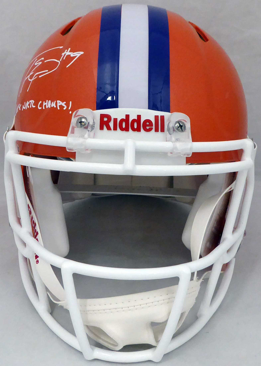 This officially licensed Riddell Full Size Authentic Speed Helmet is the same style worn on the field by Clemson players. It showcases the classic orange shell with white paw logo, gray facemask, and full interior padding for an authentic game-day look. Each helmet has been hand-signed by Travis Etienne with the commemorative inscription “2018 Natl Champs!” and is certified authentic by Beckett Authentication Services (BAS). A tamper-proof Beckett hologram and matching Certificate of Authenticity are included.