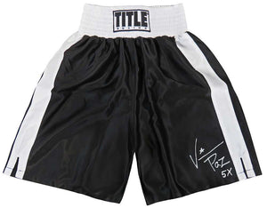 Vinny Pazienza signed Title black with white trim boxing trunks with '5x' inscription. Item comes with a Schwartz Sports Memorabilia tamper-proof numbered hologram and Certificate of Authenticity which can be verified online.