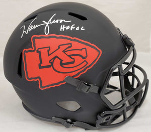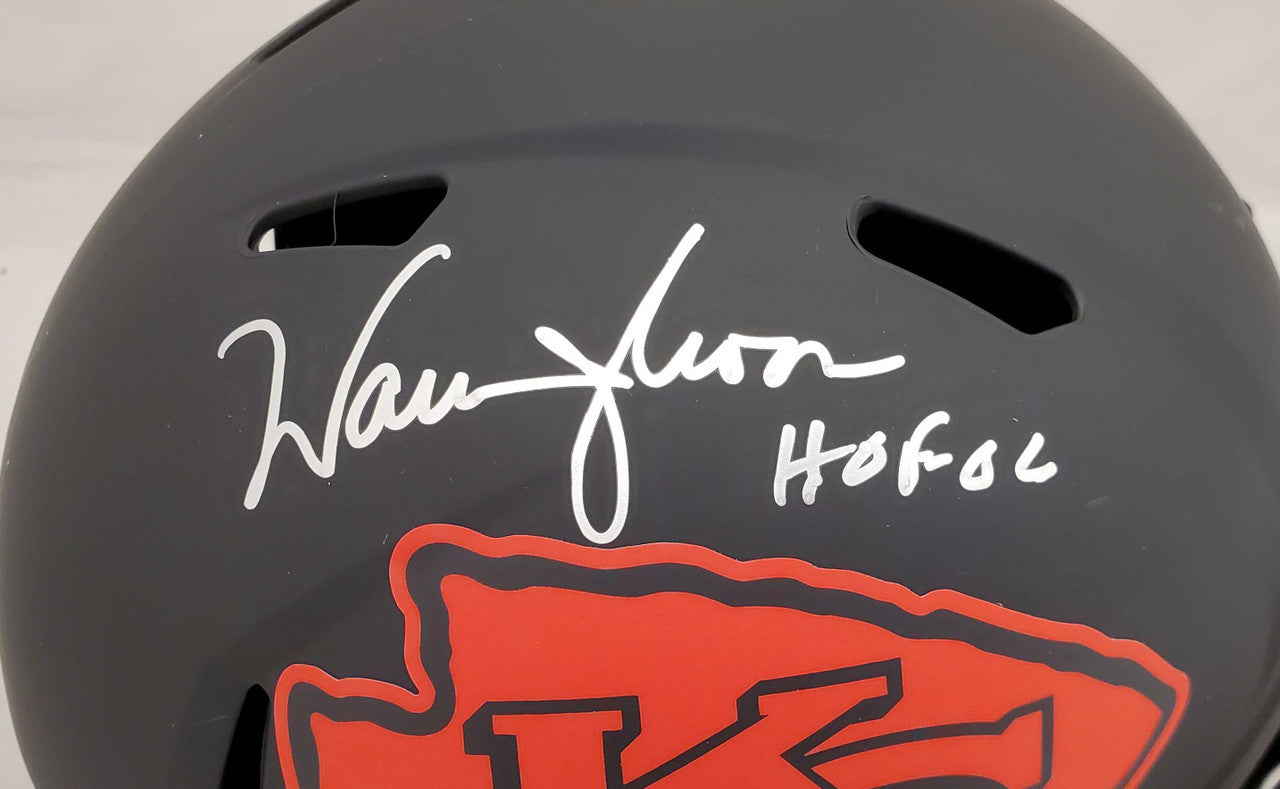 This is a Kansas City Chiefs Eclipse Black Full Size Speed Replica Helmet that has been hand signed by Warren Moon. Moon inscribed this item "HOF 06." This item was signed in the presence of a Mill Creek Sports representative and comes with their serial numbered hologram and matching certificate of authenticity. NOTE: The Eclipse Black helmets are very delicate and often have some marks or scratches on them.