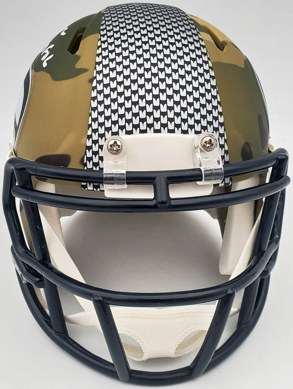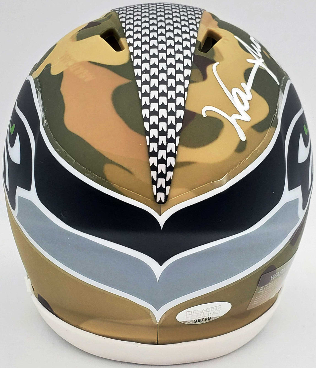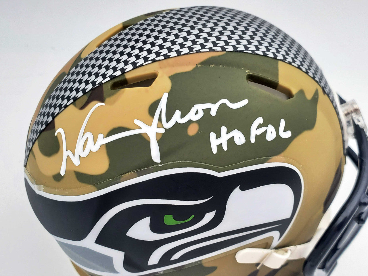 This is a Seattle Seahawks Camo Mini Helmet that has been hand signed by Warren Moon. Because each Camo helmet is hand-dipped using water-transfer technology there may be slight imperfections. This item was inscribed "HOF 06." This item was signed in the presence of a Mill Creek Sports representative and comes with their serial numbered hologram and matching certificate of authenticity.