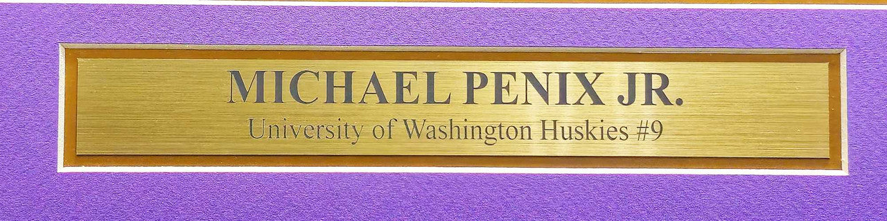This beautifully presented Framed Custom Washington Huskies White Jersey measures approximately 31x36 inches and features a bold, clean autograph from Michael Penix Jr.. The signature has been authenticated under the prestigious Beckett Authentication Services (BAS) Witness Program, meaning a Beckett representative personally observed the signing. A tamper-proof BAS Witness hologram is included for lifetime proof of authenticity.