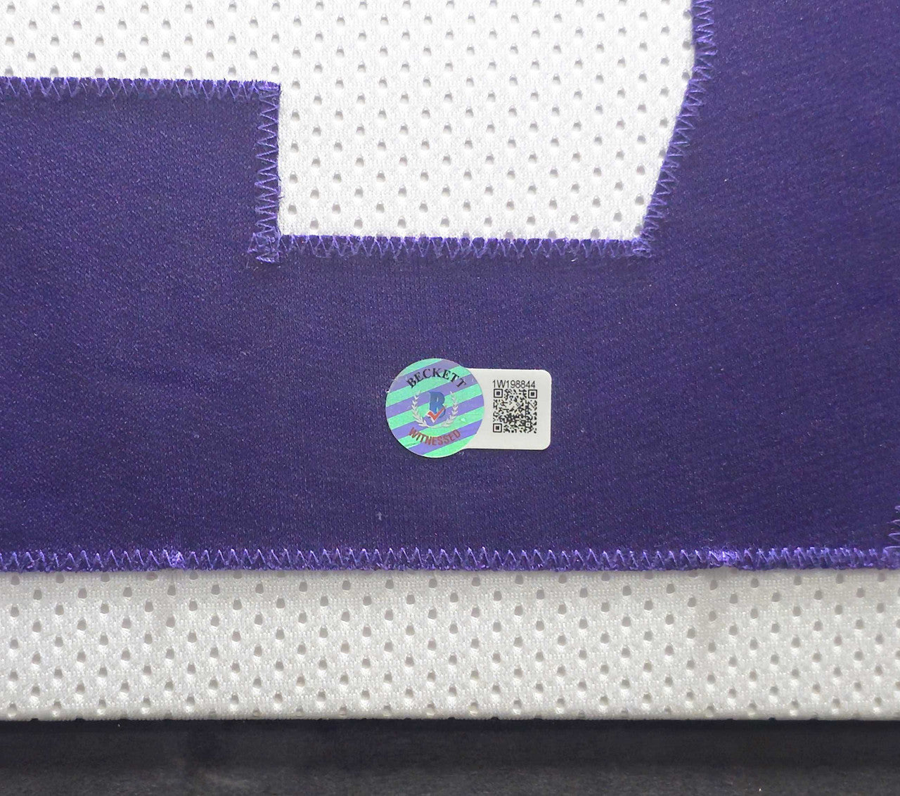 This jersey has been authenticated under the Beckett Authentication Services (BAS) Witness Program. A Beckett representative personally witnessed the signing, ensuring the autograph's authenticity for the lifetime of the item. The tamper-proof hologram allows for instant verification through Beckett’s online database.